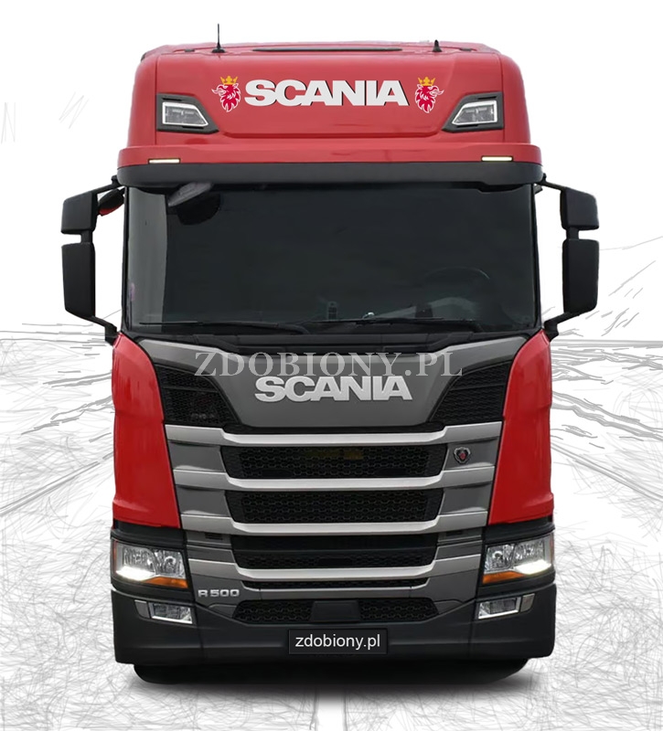 Elegancka naklejka z napisem Scania, ozdobiona logo Gryffina, jest dedykowana do kabin ciężarówek. Produkt ten ma na celu dodanie charakteru i unikalności pojazdom ciężarowym. Klienci mogą zamówić tę tuningową naklejkę, co pozwala na personalizację ich ciężarówek. Naklejka łączy estetykę z funkcjonalnością, co czyni ją atrakcyjnym dodatkiem dla właścicieli pojazdów.